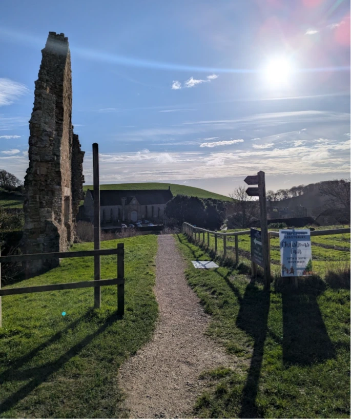 This is a 280 metre / 5 minute route, with a footpath all the way. The route follows a fairly steep incline down to the Tithe Barn. The path is mainly made up of light gravel. It’s well maintained, but uneven in places.